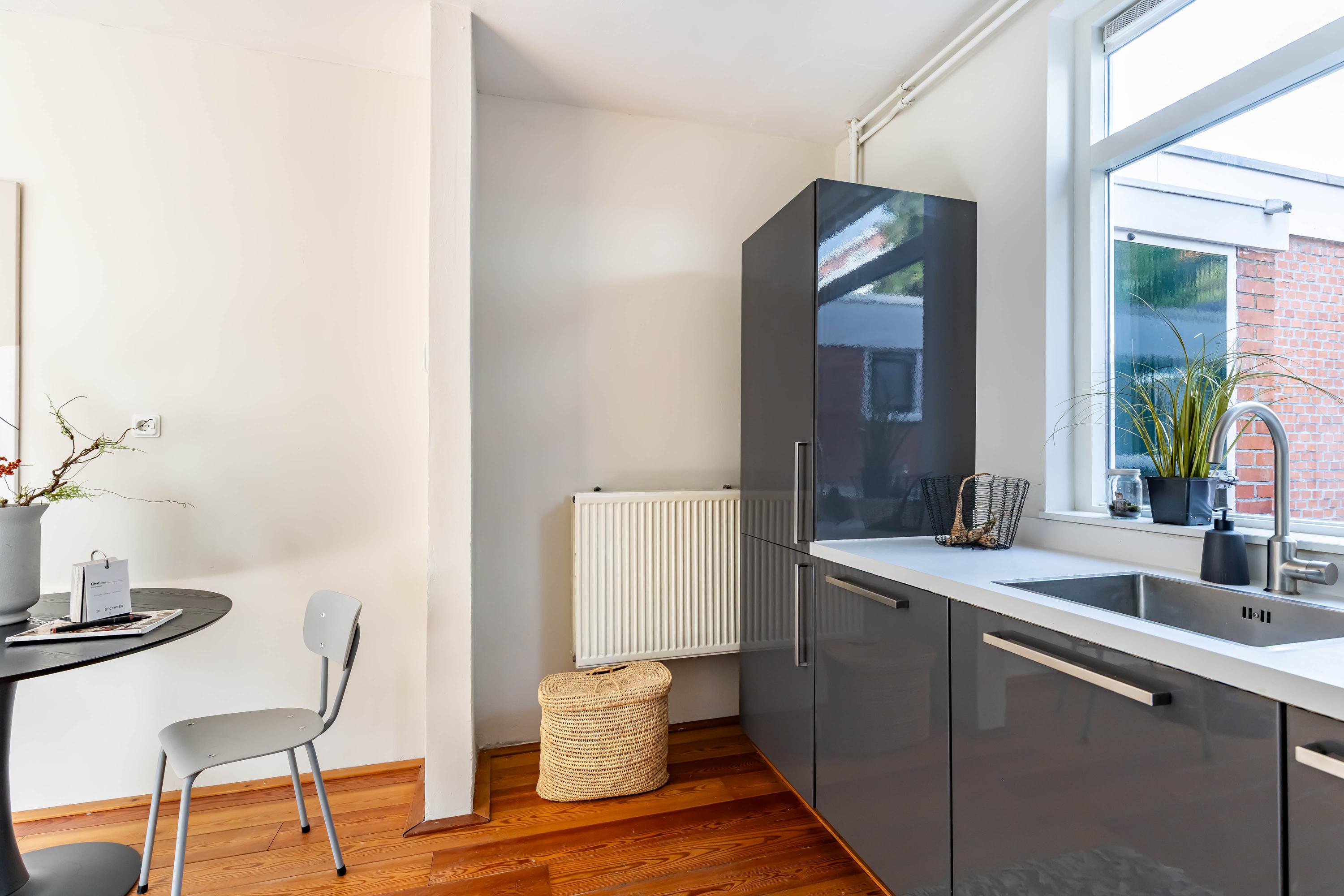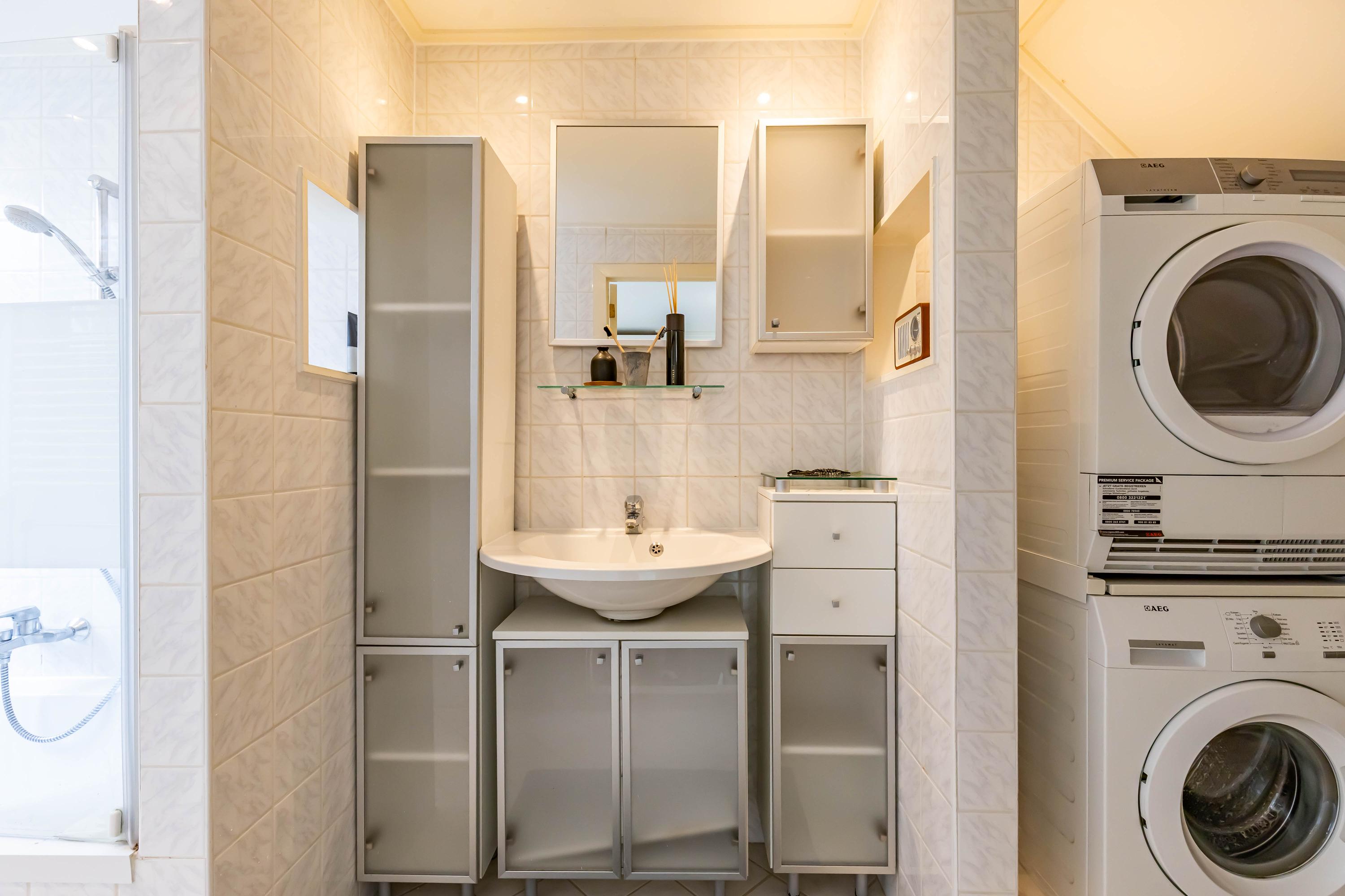 De badkamer is zodanig ingedeeld dat er zowel een sanitair gedeelte is als een handige wasruimte. Naast de douche en een groot wastafelmeubel heeft de badkamer een luxe ligbad. De keuken is voorzien van inbouwapparatuur en uitgevoerd in neutrale wit en grijstinten. De vele kasten en het werkoppervlak zorgen ervoor dat je goed uit de voeten kunt in deze ruimte.