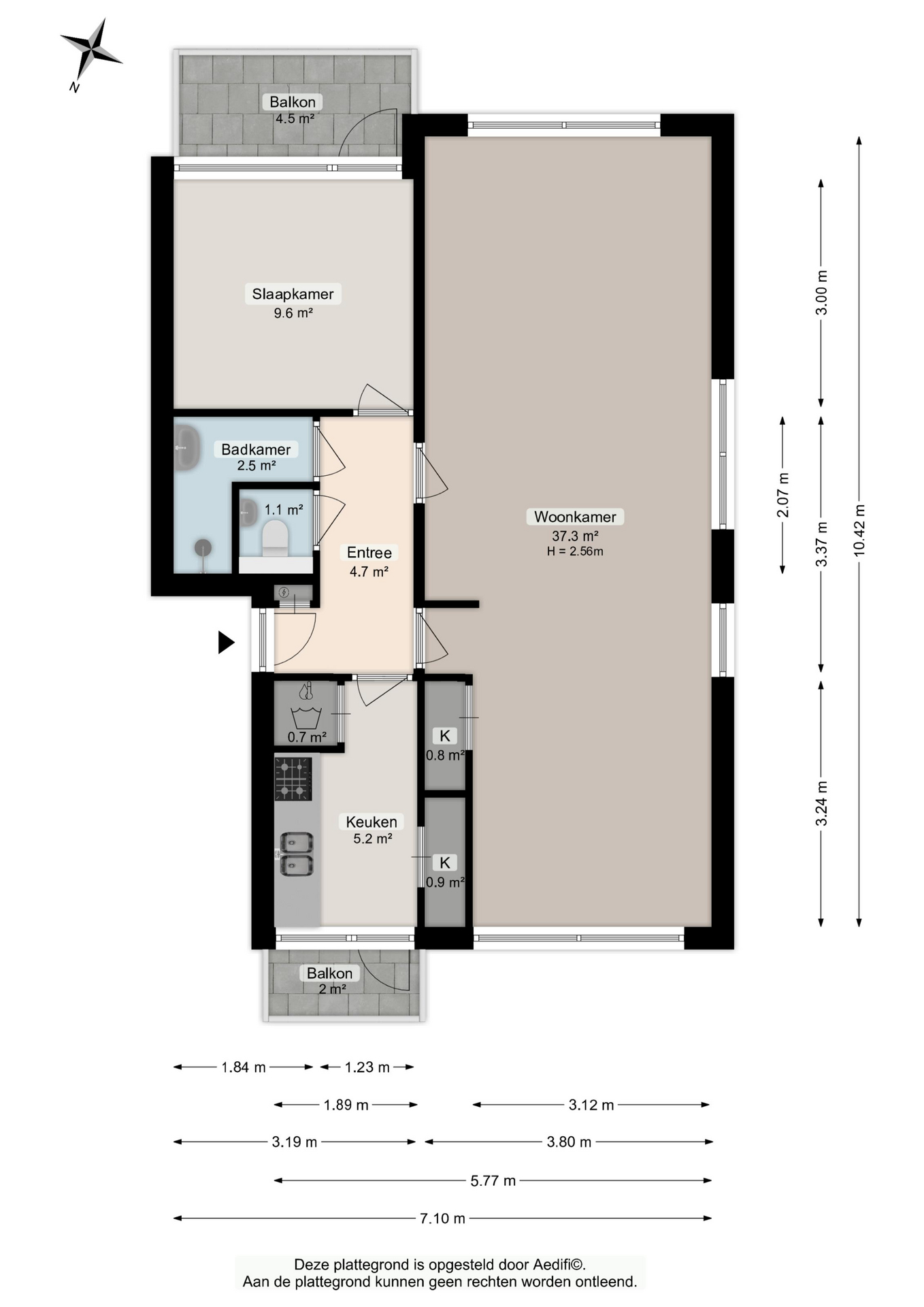 De woning heeft een ruime doorzon woonkamer, met de airco kan de ruimte snel en energiezuinig gekoeld of verwarmd worden. De slaapkamer geeft toegang tot het grote balkon op het zonnige zuiden. Vanuit de nette keuken met inbouwapparatuur kom je op het kleinere balkon aan de noordzijde. Het toilet is modern en voorzien van een zwevend toilet. De badkamer is eenvoudig maar netjes met een wastafel en douche.